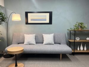 - 幾何学模様のアートとグリーンで、安心感と落ち着きを演出