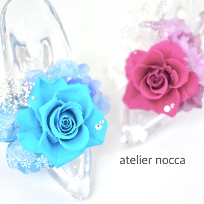 シンデレラのガラスのハイヒールのような可愛らしいプリザーブドフラワーアレンジ。可愛らしくてフェミニンな方への贈り物はもちろん、サバサバした女性の女心もくすぐられる一品です。